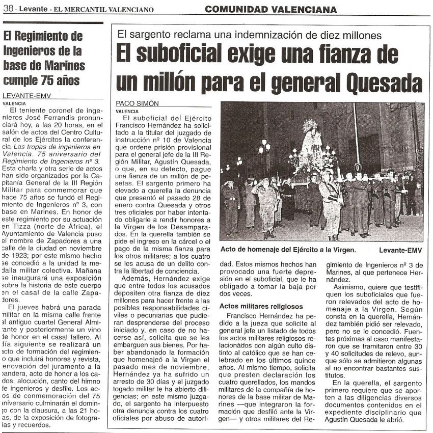 En la querella presentada por el titular de este despacho frente al General Jefe de la Región Militar de Levante por la violación de su derecho fundamental a la Libertad Religiosa al obligarle a realizar una formación militar de contenido religioso pese a solicitar ser relevado de la misma, se solicitaba el ingreso en prisión, eludible bajo fianza de diez millones de pesetas para el General Jefe de la Región Militar Levante, como se relata en este artículo periodístico al respecto. Si deseas ver la noticia al completo pincha sobre la fotografía para ampliarla.